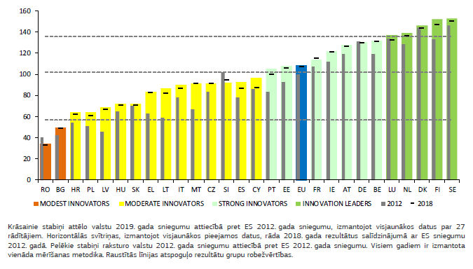 Vidējos inovācijas rezultātus aprēķina, izmantojot saliktu rādītāju – inovācijas summāro indeksu, un dalībvalstis tiek iedalītas četrās dažādās snieguma grupās. Dānija, Luksemburga, Nīderlande, Somija un Zviedrija ir inovācijas līderes, jo to inovācijas rezultāti krietni pārsniedz ES vidējos rādītājus. Austrija, Beļģija, Francija, Igaunija, Īrija, Portugāle un Vācija ir spēcīgās novatores, jo to rezultāti ir virs ES vidējiem rezultātiem vai tuvu tiem. Čehija, Grieķija, Horvātija, Itālija, Kipra, Latvija, Lietuva, Malta, Polija, Slovākija, Slovēnija, Spānija un Ungārija ir mērenās novatores, jo to rezultāti ir zem ES vidējiem rezultātiem. Bulgārija un Rumānija ir pieticīgās novatores: to inovācijas sniegums ievērojami atpaliek no ES vidējiem rādītājiem.